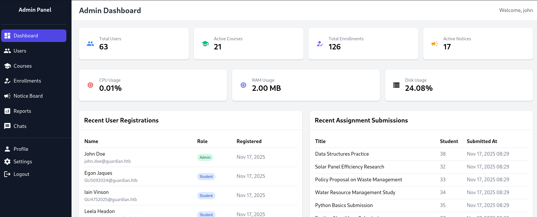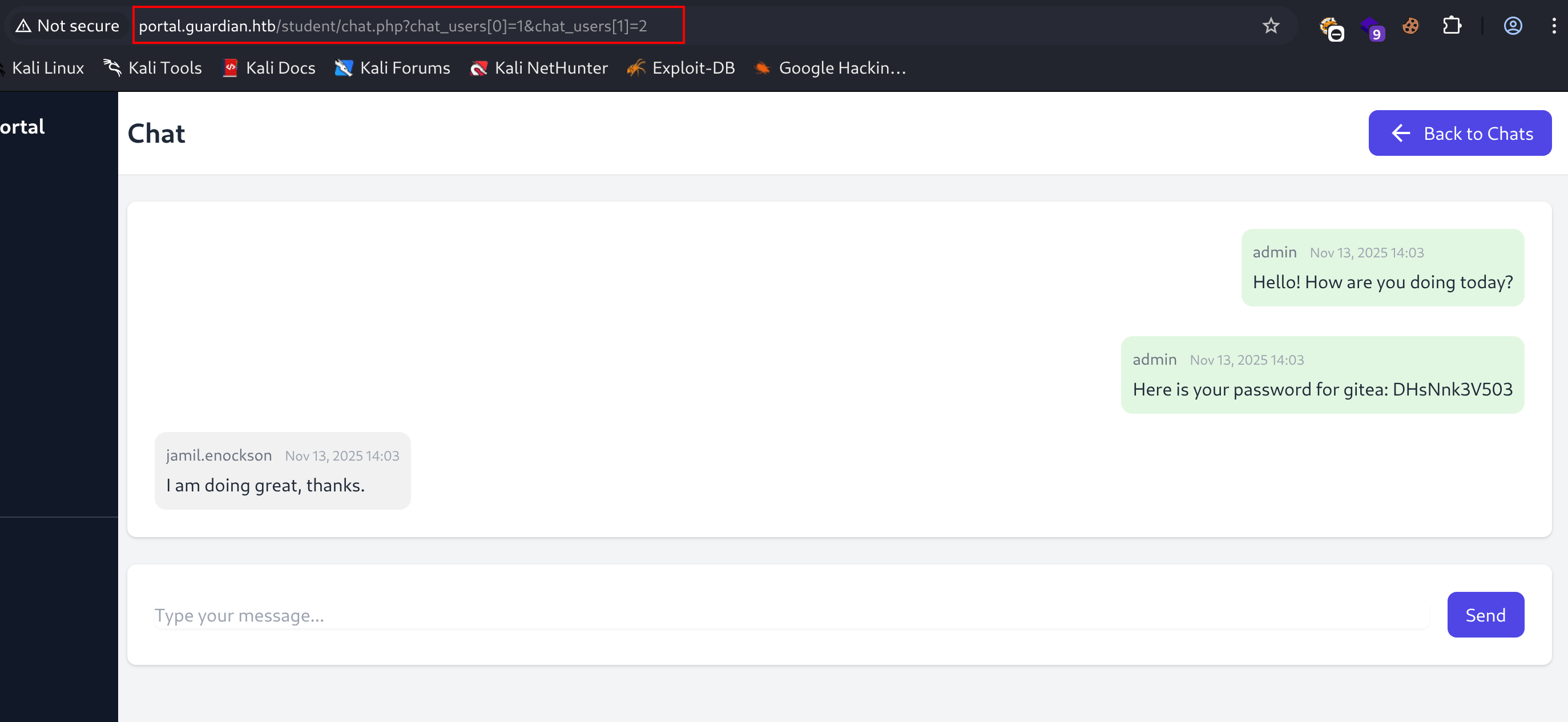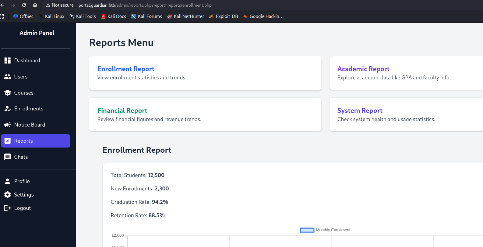 Ngoài ra còn có email admissions@guardian.htb có thể là email quản lý.