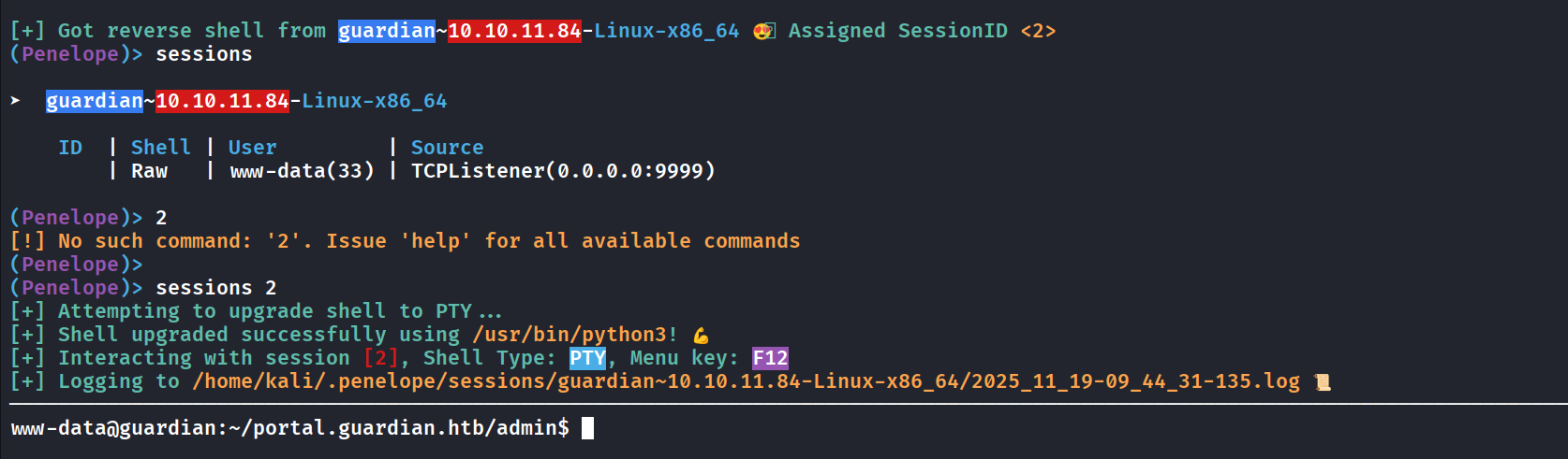 [+] Logging to /home/kali/.penelope/sessions/guardian~10.10.11.84-Linux-x86_64/2025_11_20-09_39_16-468.log 📜