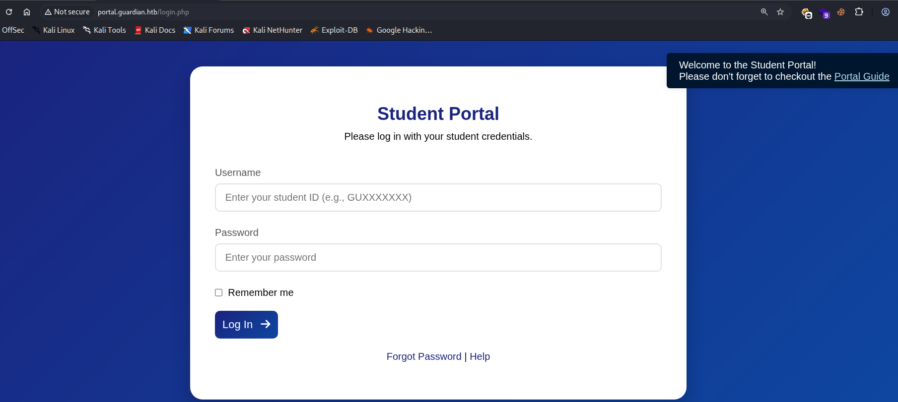 Truy cập vào trang web và tìm thấy nơi truy cập portal.guardian.htb